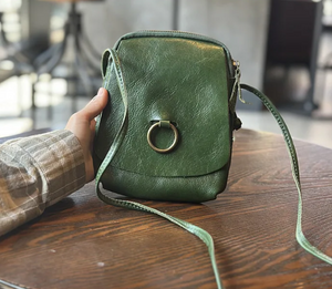 Embrace timeless style with this Compact Vintage Leather Crossbody Bag. Crafted from high-quality leather, it features a minimalist design with a stylish metal ring closure, adding rustic charm. Perfectly sized for your essentials, it's ideal for errands or a casual day out.