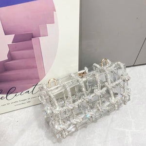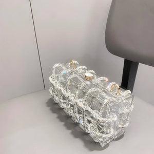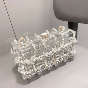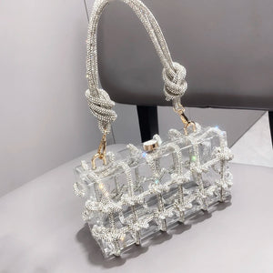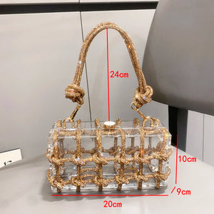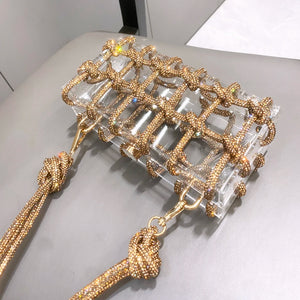 A bold and glamorous handbag that combines a transparent acrylic body with a dazzling rhinestone-wrapped rope design. Unique and eye-catching, this bag is the ultimate statement piece for nights out, events, and special occasions.