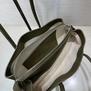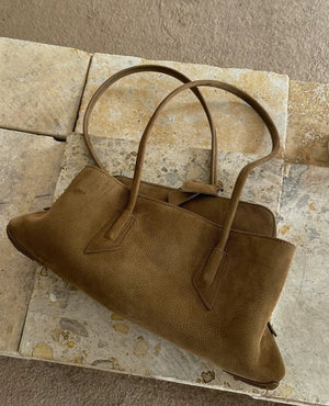 Elegant suede shoulder bag with a slim elongated shape and softly contoured sides.