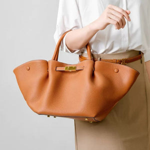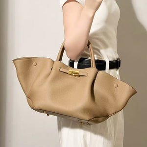 This tote bag is crafted from premium genuine leather, offering a timeless balance of elegance and practicality. Its wide, structured silhouette provides generous space while maintaining a refined shape. Designed for both everyday use and special occasions, it transitions seamlessly from work to travel to casual outings. The polished metal detail at the top closure adds a touch of sophistication, while the reinforced base ensures long-lasting durability.
