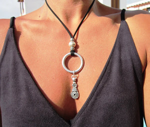This handcrafted silver pendant necklace is a stunning piece for lovers of unique and versatile jewelry. Featuring a sleek circular ring and an intricate drop pendant, it’s strung on a durable leather cord for a chic, boho-inspired look.