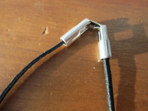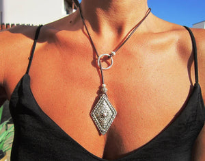 Embrace a touch of bohemian elegance with this 48 cm handcrafted leather and silver necklace. The diamond-shaped pendant showcases intricate, vintage-inspired details, making it a standout accessory for any occasion. The smooth black leather cord adds a rustic yet refined touch, while the hook closure ensures secure and comfortable wear.