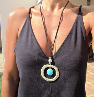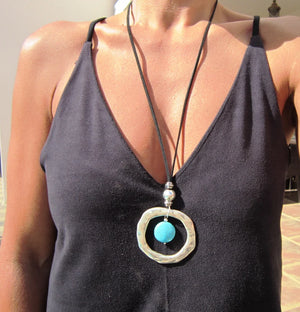 This long pendant necklace is a perfect statement piece for women who love unique, bohemian-inspired designs. Featuring a striking turquoise bead and a hand-crafted silver pendant, this necklace combines simplicity and elegance. Its adjustable choker-style strap offers versatility, while its lightweight design makes it ideal for daily wear or special occasions.