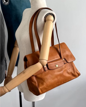 This premium leather satchel is a blend of vintage elegance and modern functionality. Crafted from natural first-layer cowhide and genuine leather, it offers a timeless design with a soft, textured feel. The rich, earthy tones of this bag make it a versatile accessory for both casual outings and business settings.